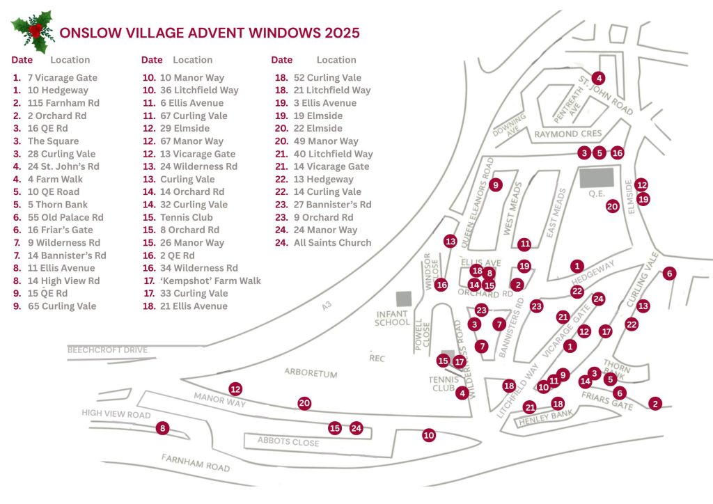 Click here to download a bigger version for printing. Windows start lighting up from 1st December, with 2 or 3 new windows lighting up each day until 24th December. Windows are lit between 4 – 8pm each evening. From 25th – 31st December all 52 windows should be lighting up every day!
