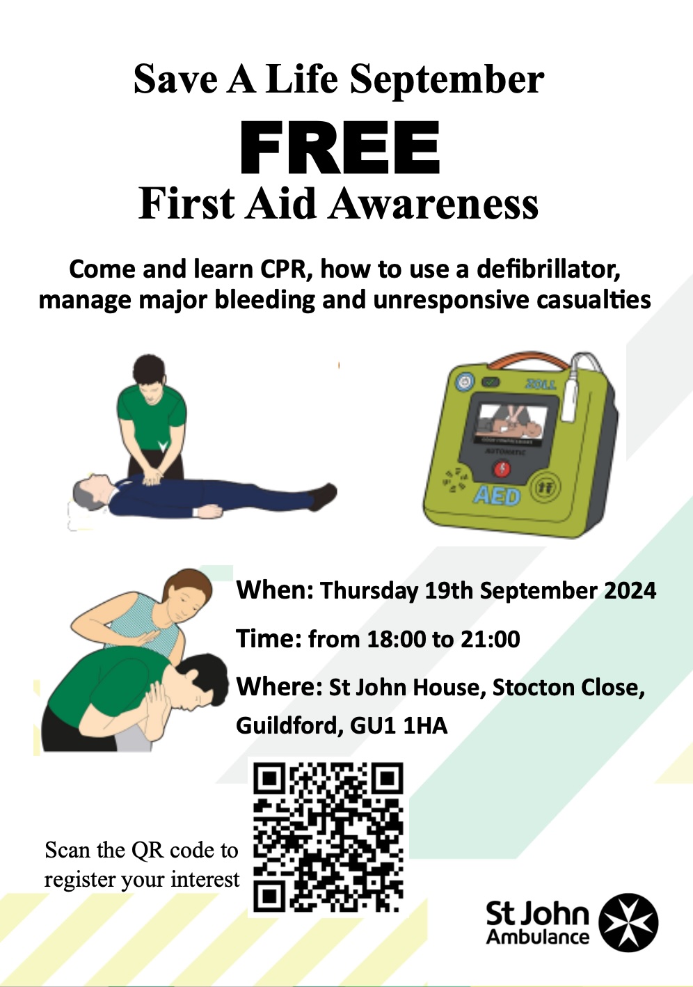 Calendar of Events for Onslow Village « All Events This event has passed. Save A Life September – free first aid training from St. John Ambulance September 19, 2024 @ 6:00 pm - 9:00 pm Free « Garden Club Talk: Vegetables for Showing and Kitchen Craft Day with Karen Telfer » Click here for poster Add to calendar Google Calendar iCalendar Outlook 365 Outlook Live Details Date: September 19, 2024 Time: 6:00 pm - 9:00 pm Cost: Free Venue St John House Stocton Close Guildford, GU1 1HA + Google Map