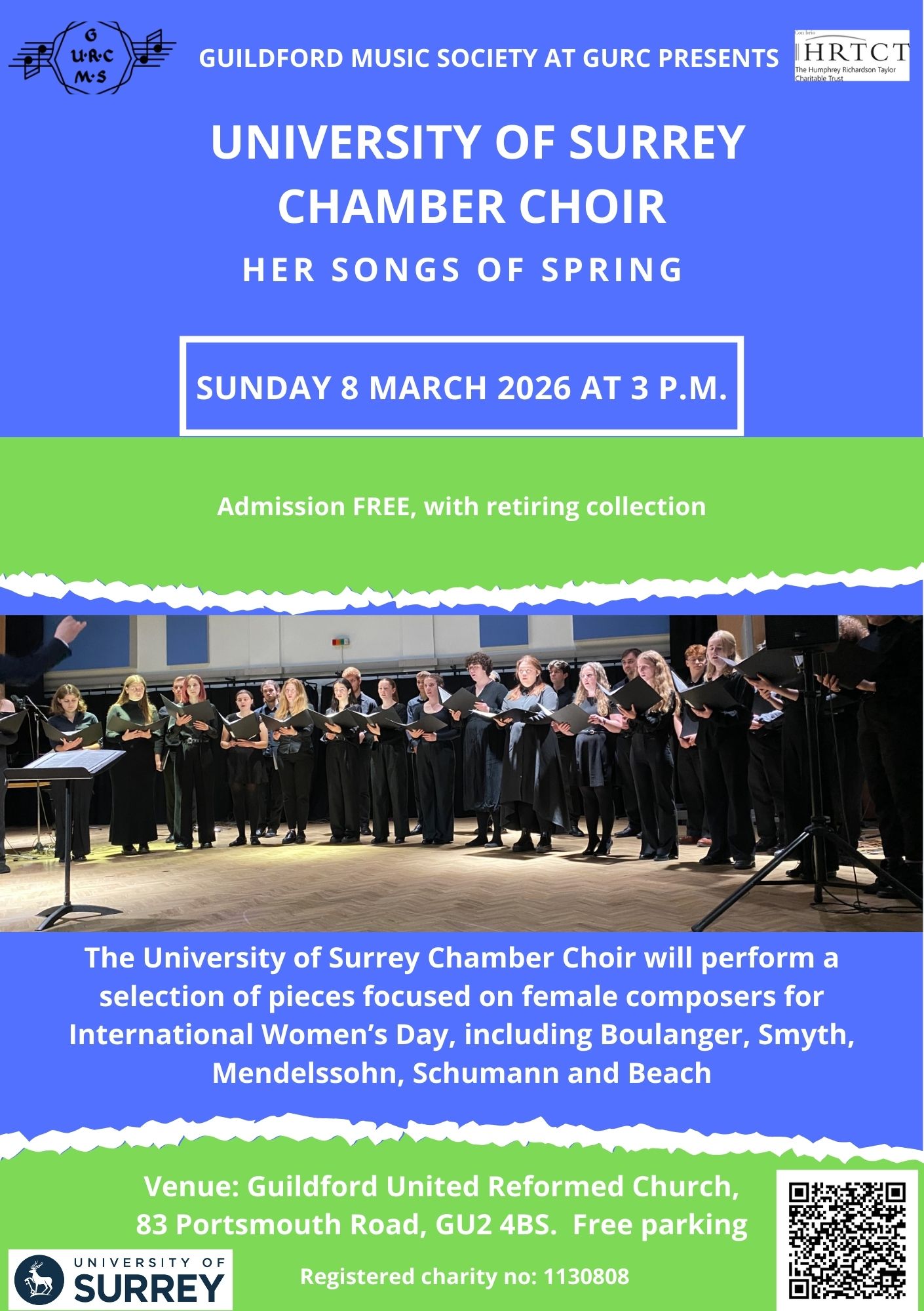 | Sunday 8th March | UniS Chamber Choir Concert – Her Songs of Spring Guildford United Reformed Church, Portsmouth Road. 3pm Free with retiring collection |