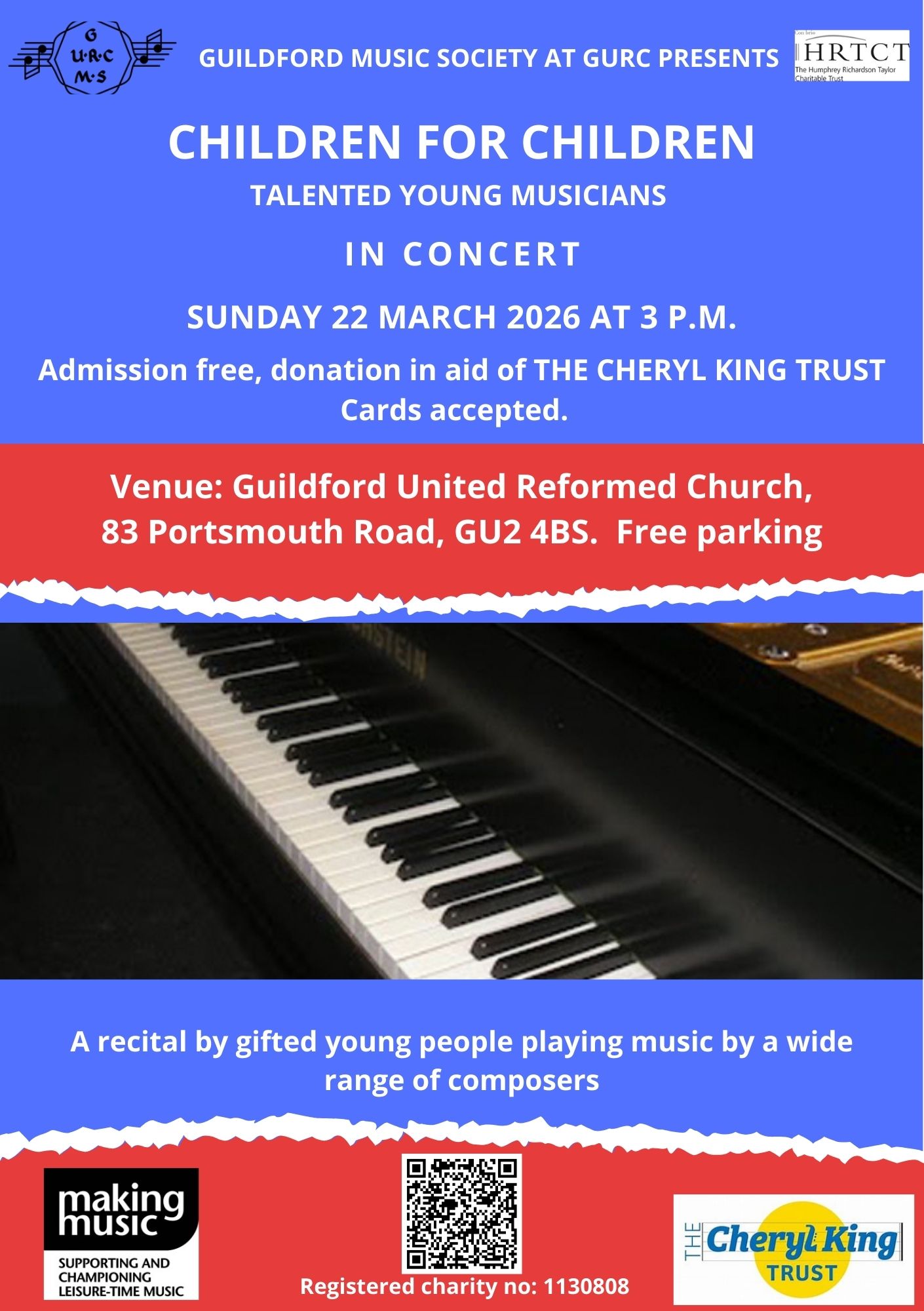 | Sunday 22nd March | Children for Children: Talented Young Musicians in Concert 3pm Guildford United Reformed Church Free with retiring collection for Cheryl King Trust |