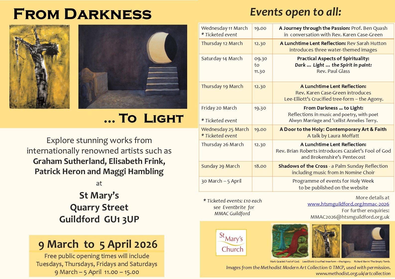 | Monday 9th March | Opening day of ‘From Darkness to Light’ art exhibition at St Mary’s Church. 9th March – 5th April. Free entry, Tuesdays, Thursdays, Fridays and Saturdays 11am – 3pm |