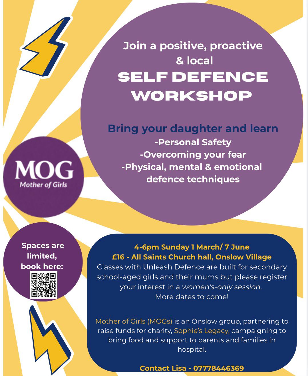 | Sunday 1st March | Self Defence Workshop for Mums and their Teenage Daughters 4 – 6pm All Saints Church Hall. £16 To book a place contact Lisa Popplewell on 07778 446369 More classes coming, including adults only. Get in touch with Lisa on the number above to secure your interest. |